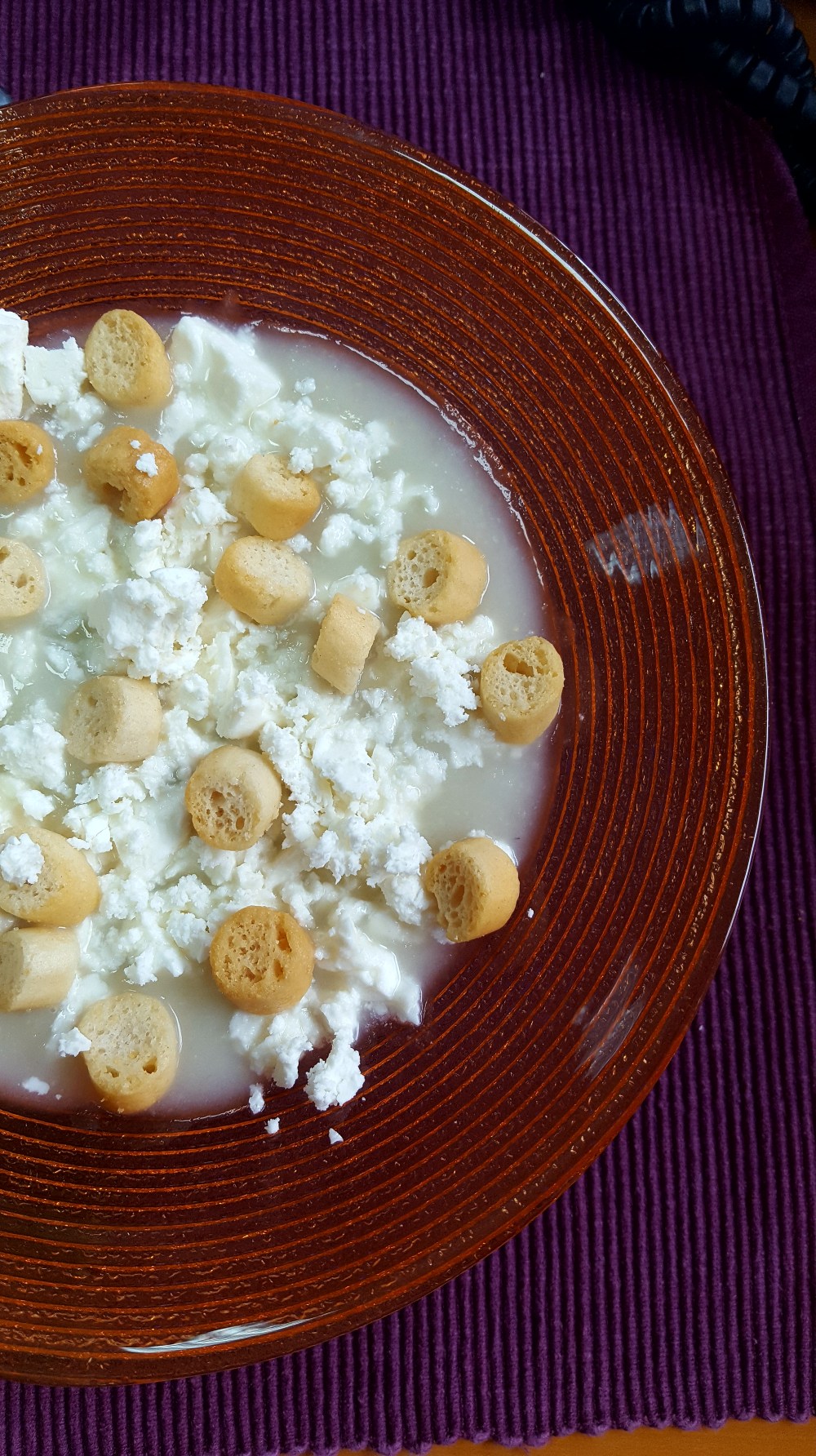 Servite la vellutata calda con la feta sbriciolata come nella foto e con crostini a piacere.