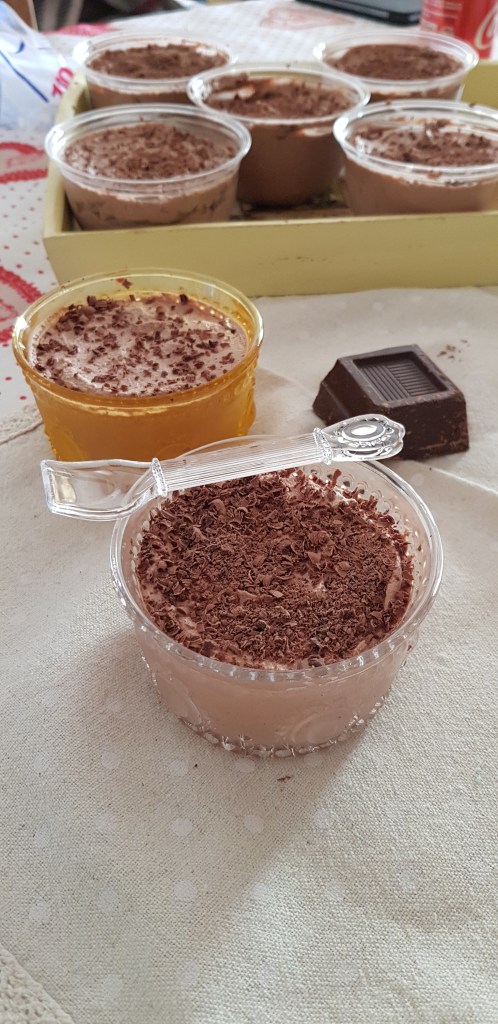 Dolci al cucchiaio… la mia passione. Tra tutti i dolci quelli al cucchiaio sono quelli che preferisco, ogni volta che ne ho l’occasione ne provo uno e oggi vi racconto come ho preparato la mousse al cioccolato fondente, tra le tante versioni questa è quella che mi piace di più, soprattutto perché ha solo 3 ingredienti: cioccolato fondente, latte e panna da montare.Per 12 coppette:Fate sciogliere 350 gr di cioccolato fondente a bagno maria a fuoco bassissimo. Scaldate 250 ml di latte e appena il cioccolato sarà sciolto incorporate il latte, mescolate delicatamente per evitare grumi. Montate a neve la panna (500ml) e quando sarà pronta aggiungete il cioccolato mescolando piano con una spatola dall’alto verso il basso per evitare di smontare la panna. Quando tutti gli ingredienti saranno ben amalgamati, disponete il composto nelle coppette e mettete in frigo 2 ore circa prima di servire.Suggerimenti: lasciate la panna in frigo tutta la notte prima di montarla a neve, troverete lo stesso suggerimento nella confezione della panna.