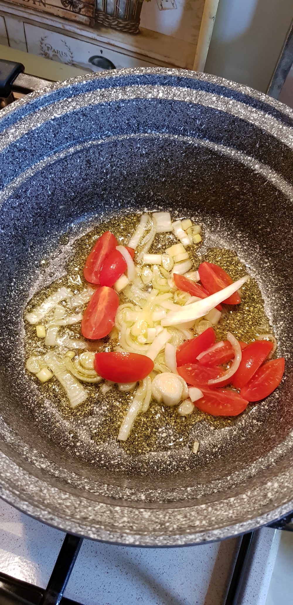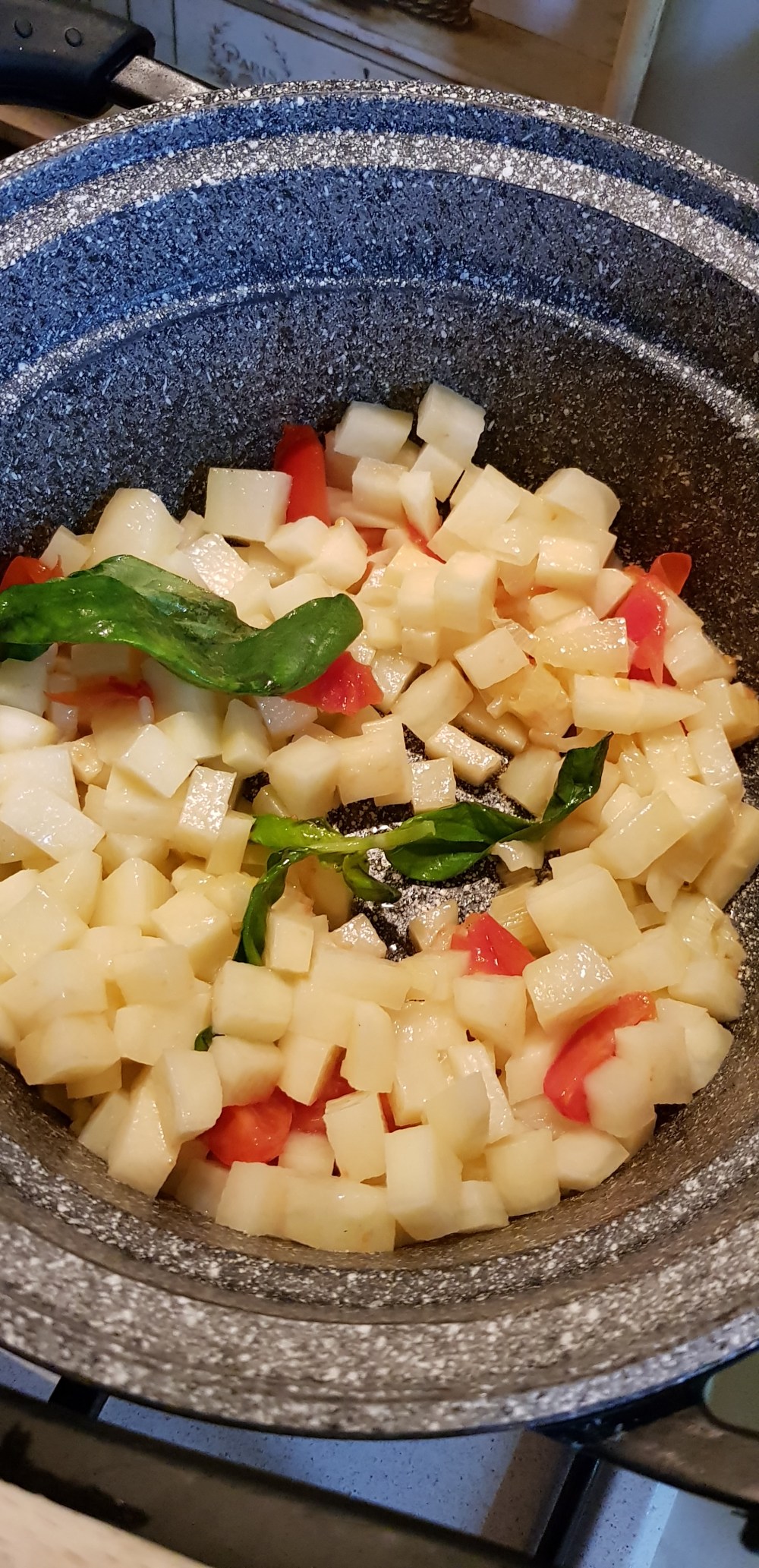 Mettete a rosolare una cipollina fresca e qualche pomdorino, tagliate le patate a cubetti e aggiungetele al soffritto, aggiungete il basilico e un litro d’acqua già calda, salate e cuocete per 10 minuti.