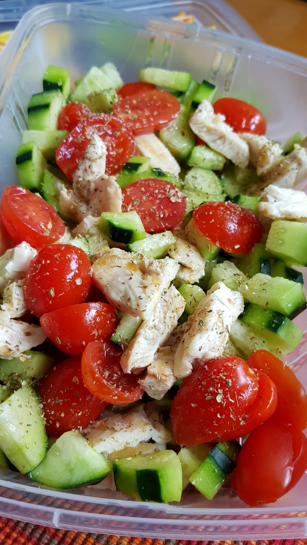 Grigliate il petto di pollo in una piastra e nel frattempo tagliate i pomodorini e i cetrioli e condite con olio, sale, limone e origano. Aggiungete il pollo tagliato a striscioline et voilà… la vostra schiscetta è servita.