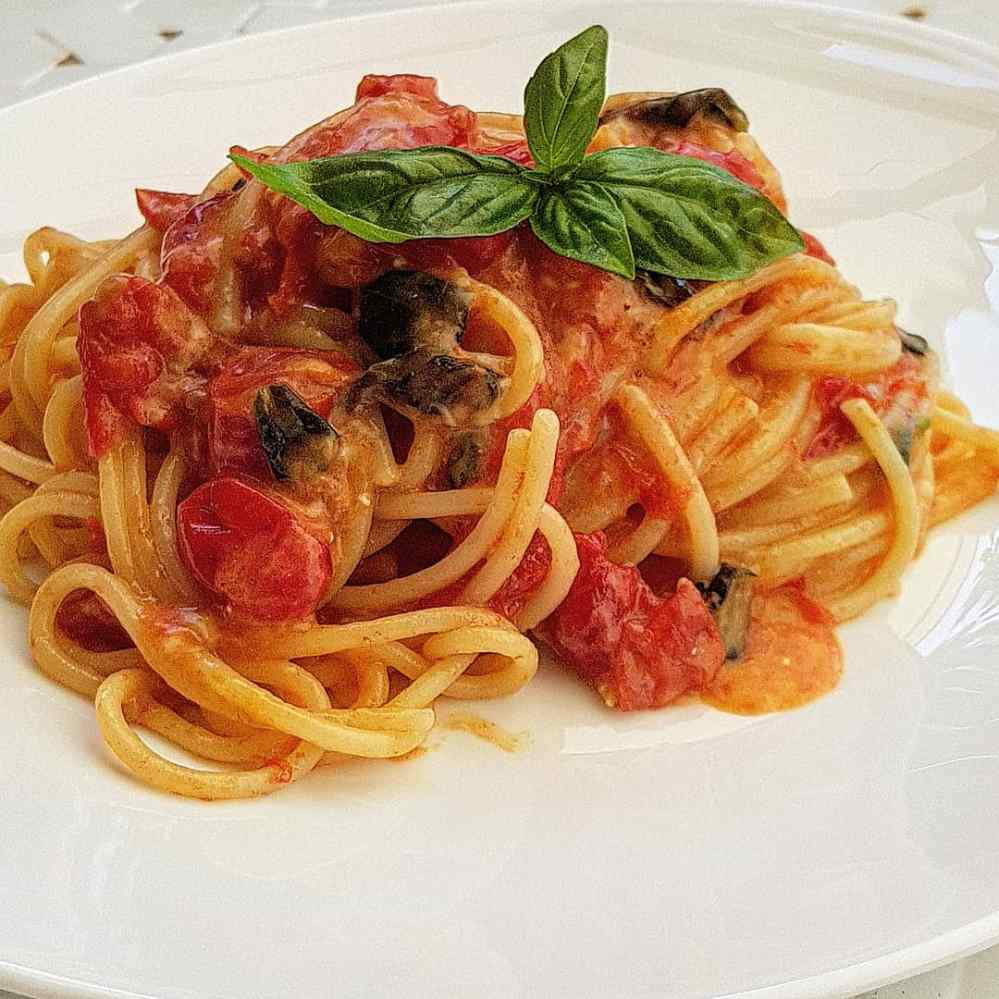 Per 2 persone 160 gr di spaghetti, 15 pomodorini, 1 spicchio d’aglio e un peperoncino fresco, tanto basilico e pecorino.