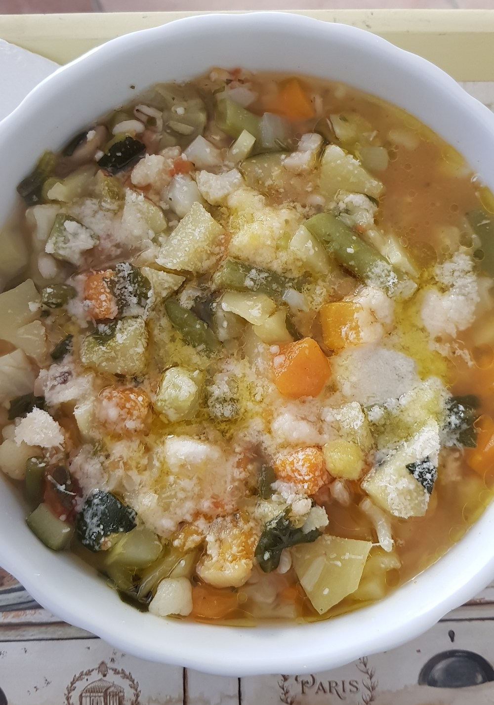 Cipolla, carote, sedano, zucchine, fagiolini (erano gli ultimi dell’orto di mio padre), zucchine, patate, funghi champignon, pomodorini, come di cavolfiore.