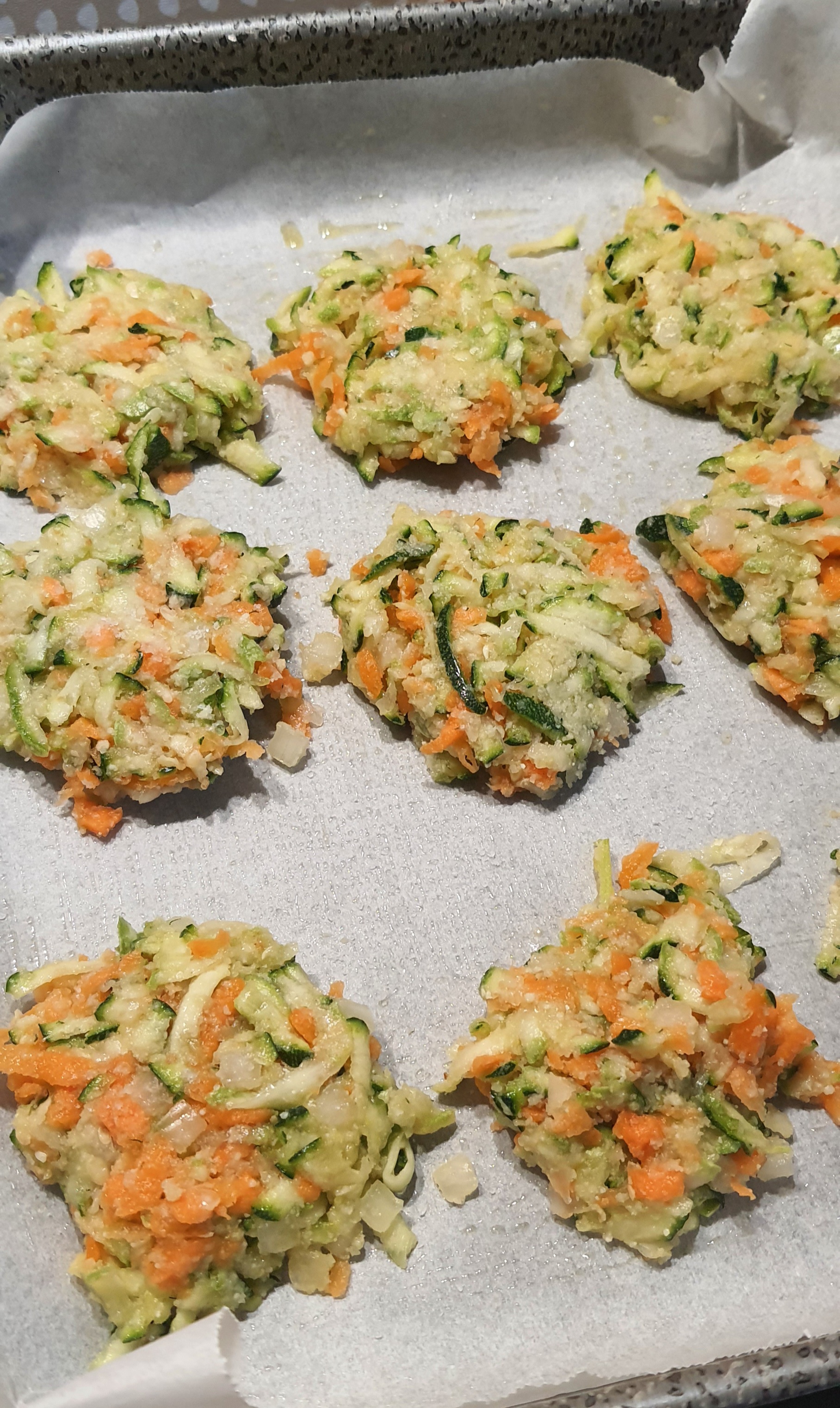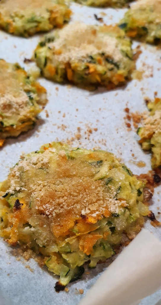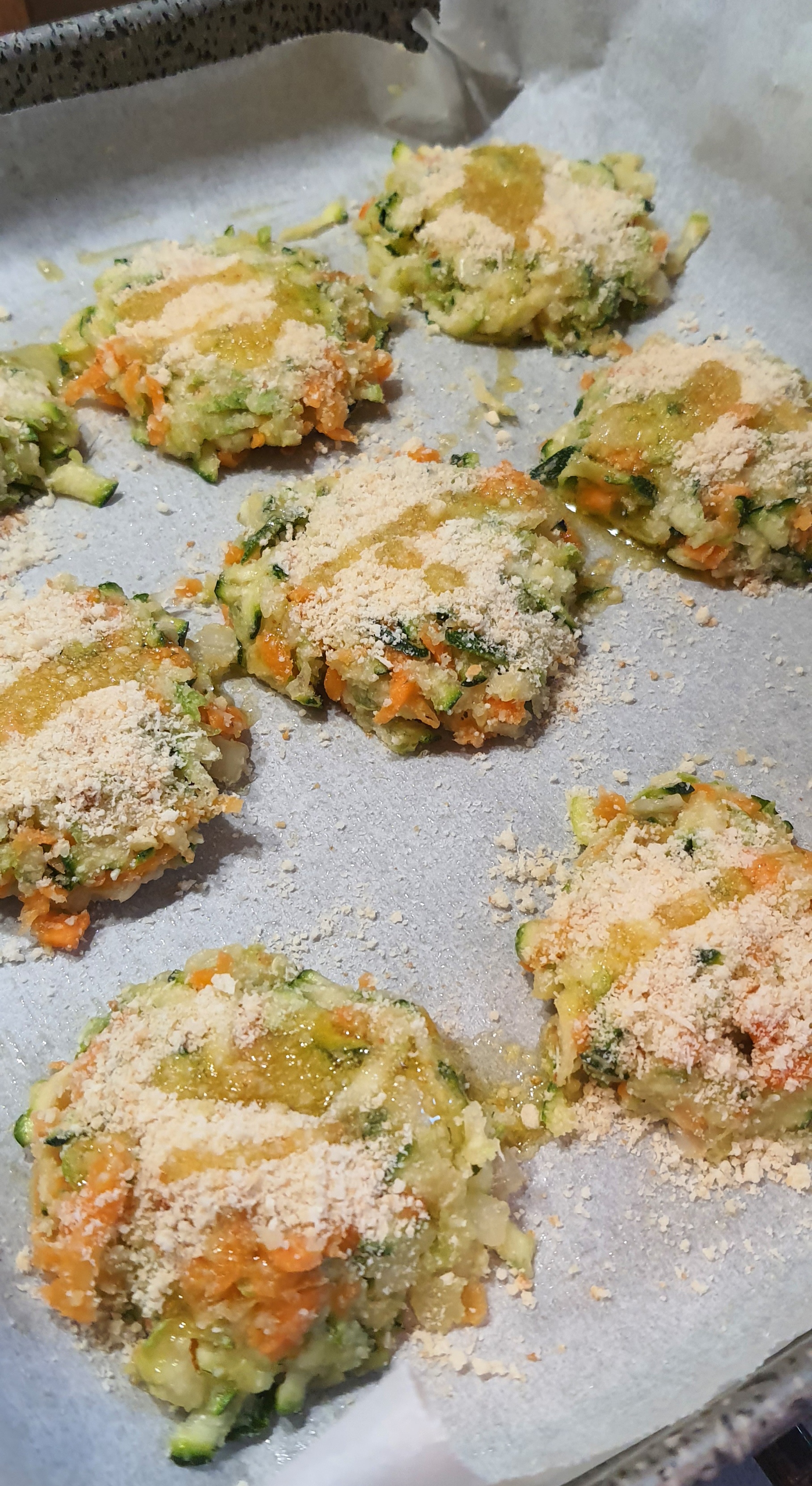 Grattugiate le verdure con la grattugia a scaglie, aggiungete l’aglio in polvere, un pizzico di sale, un cucchiaio di pan grattato e 1 cucchiaio di parmigiano. Amalgamate bene e create delle polpette che andrete ad appiattire su una teglia rivestita con la carta da forno. Spolverate la superficie con altro pan grattato e parmigiano, mettete un filo d’olio e infornate a 180 gradi per 10 minuti o fin quando la superficie sarà dorata.