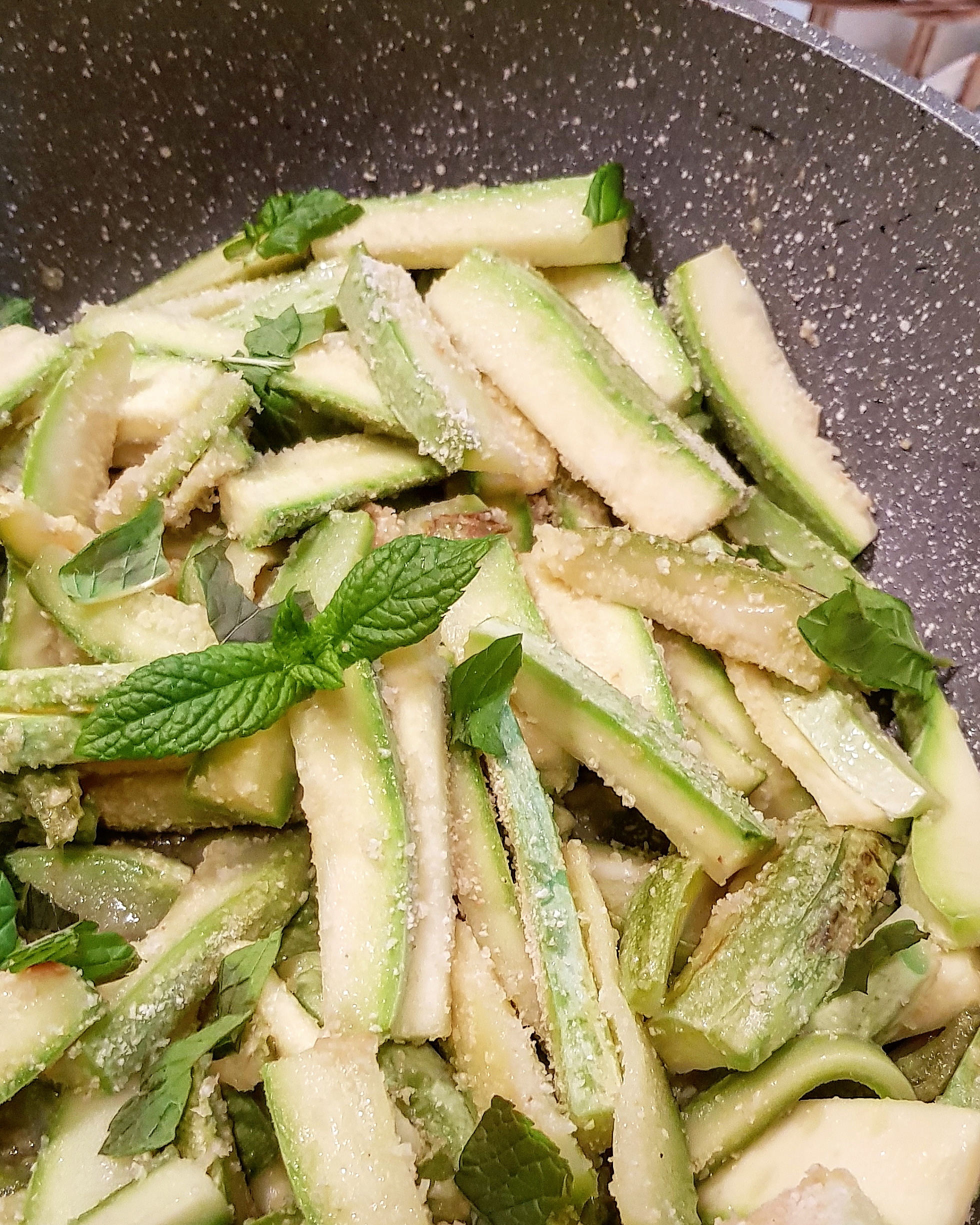 Tagliate le zucchine a strisce nel senso della lunghezza e mettete a rosolare uno spicchio d’aglio che vi suggerisco di eliminare prima di tuffare le zucchine in padella. Fate cuocere qualche minuto a fiamma viva, aggiustate di sale e se necessario aggiungete una tazzina di acqua per proseguire la cottura. Quando saranno pronte (meglio se ancora leggermente croccanti) tagliuzzate la menta con le mani e aggiungete qualche cucchiaino di pan grattato e spegnete la fiamma. Amalgamate bene e servite, saranno buonissime sia calde che fredde!